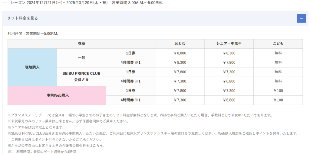 その他、軽井沢プリンス公式HPからもお得な事前購入が可能ですので見てみてください。その他、山頂まで行ける高速リフト2本の優先乗車が可能な優先搭乗券も各日限定販売で購入可能ですので、気になる方はチェックしてみてださいね。